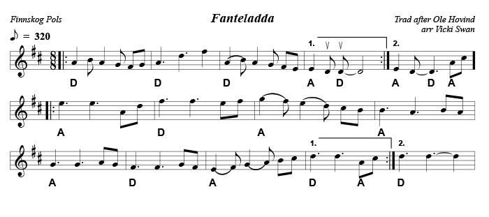 X:1 T:Fanteladda C:Trad. efter Ole Hovind C:Arr. Vicki Swan R:Finnskog Pols L:1/4 M:8/8 |:"D"AB/AG/ F/G/|"D"A3/d3/f/|"D"(AB/)AG/ F/E/|1"A" ED/ "D"(D/D2):|2"A"E (D/"D"D3/)"A"A/c/|| |:"A"e3/e3/A/d/|"D"f3/f3/e/f/|"A"(gf/)(ed/) c/B/|"A"B3/A3/B/A/| "A"G3/G3/A/G/|"D"F3/F3/G/F/|"A"(EF/)(GA/) B/c/|1"D"d3/d3/"A"A/d/:|2"D"d3/(d3/d)|]