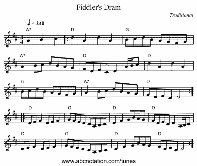 X:26 T:Fiddler's Dram C:Traditional M:4/4 L:1/8 Q:1/4=240 K:D "A7"A2B2 c2|:"D"d2A2 d2A2|"G"BcdB AGFG|"A7"A2Bc dBAG|"D"FDEC D2A/B/c|! "D"d2A2 d2A2|"G"BcdB AGFG|"A7"A2Bc dBAG|"D"FDEC D4:|! |:"D"DEF2 DEF2|"G"GFED CA,B,C|"D"D2F2 GBAG|"D"FDEC D2A,/B,/C|! "D"DEF2 DEF2|"G"GFED CA,B,C|"D"D2F2 GBAG|"D"FDEC D4:|!