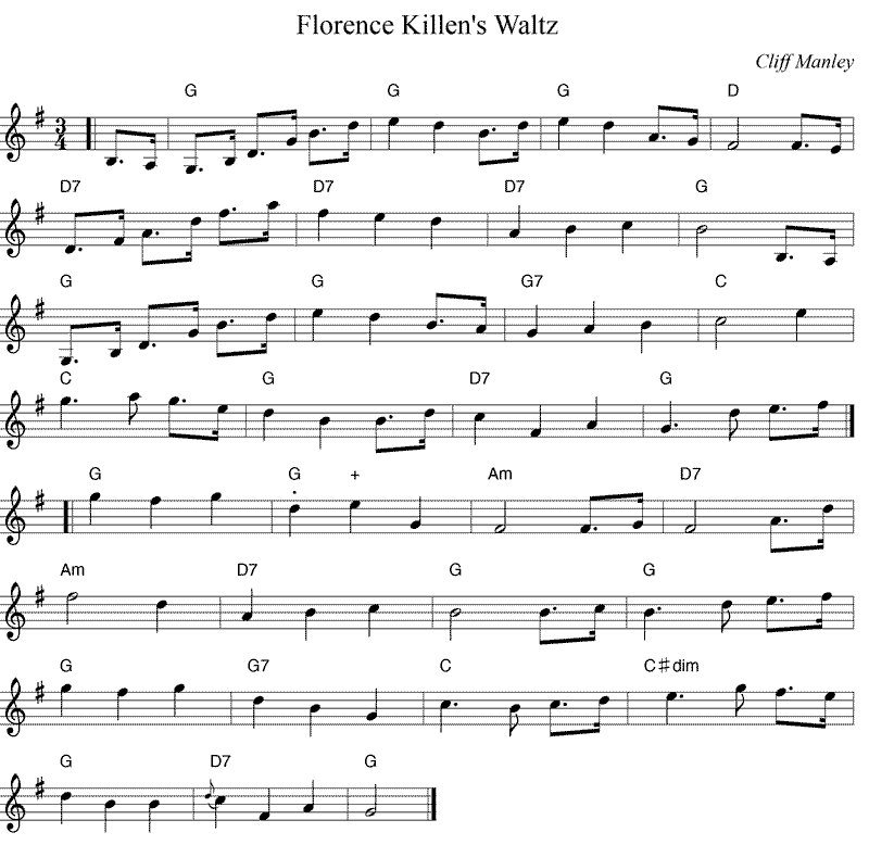 Notes: Composed in honor of Florence Killen of Nova Scotia who herself composed the River John Sunset Waltz, aka Saint John River Waltz.