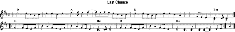 X: 1 T: Last Chance R: march S: Fiddle Hell Online 2022-3-26 handout for Fiddle Hell jam session B: the Portland Collection 2 p.115 Z: 2022 John Chambers M: C| L: 1/8 F:http://trillian.mit.edu/~jc/music/abc/session/FiddleHell/march/Last_Chance_PC-D-32-2.abc 2026-02-14 004751 UT K: D |:\ "D"d4 dBAB | d2d2 B2d2 | "A"e3f e2f2- | fefe dBAB ||\ "D"d4 dBAB | d2d2 B2A2 | F4 FED2 | "Bm"[D3B,3][DC] [D4B,4] :| |:\ "D"F4 FEDF | B2A2 FEDF | B2A2 FED2 | "Bm"[D3B,3][DC] [D4B,4] ||\ "D"F2F2 FEDF | B2A2 FED2 | "Bm"[D4B,4] [D3B,3][DB,] | [D2B,2][D2-B,2-] [D2B,2] [1 DE :|2 A2 |]