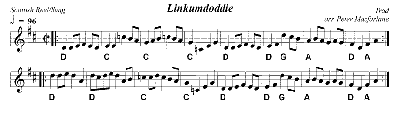 X:1 T:Linkumdoddie C:Trad. R:Scottish Reel Song K:Dmaj M:C| L:1/8 |:"D"D2DEF2ED|"C"E2E2=c2BA|G2AB=c2BA|G2=C2E2G2| "D"D2DEF2ED|"D"E2F2"G"d2cB|"A"A2BAG2AG|"D"F2D2"A"F2A2:| |:"D"d2ded2A2|dcded2AB|"C"=c2cdc2BA|G2=C2E2G2| "D"D2DEF2ED|"D"E2F2"G"d2cB|"A"A2BAG2AG|"D"F2D2"A"F2A2:|]
