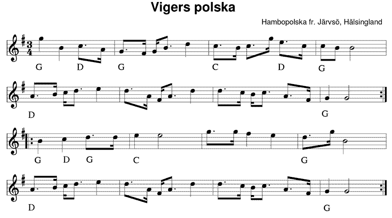 Site visitor Hanne Bornfelt writes, “[This] is called Vigers Polska, and come from Sweden. Hambopolska after shoemaker Wiger, Boda, Järvsö, Hälsingland, written down by Johan Hall, Lottefors.”