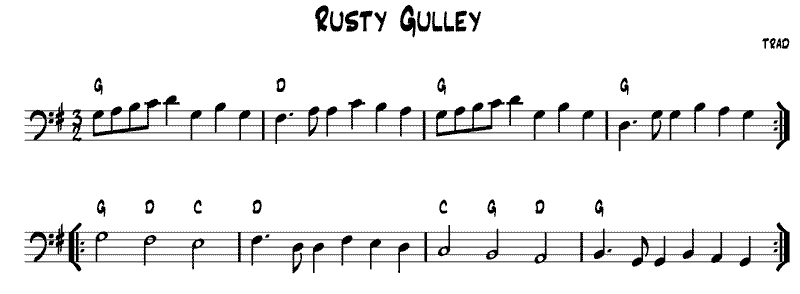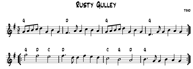 X: 10 T: The Rusty Gulley R: three-two M: 3/2 L: 1/8 K: Gmaj |:G/A/B/c/ dG BG|FA Ac BA|G/A/B/c/ dG BG|DG GB AG:| |:g2 f2 eg|fd df ed|ce/c/ Bd/B/ Ac|BG GB AG:|