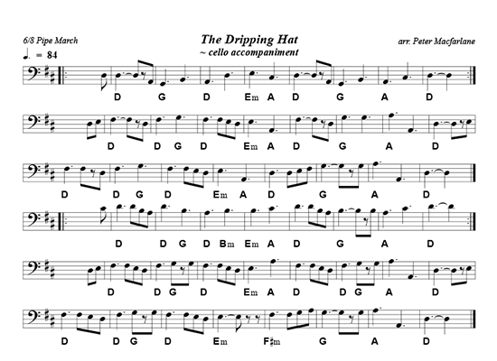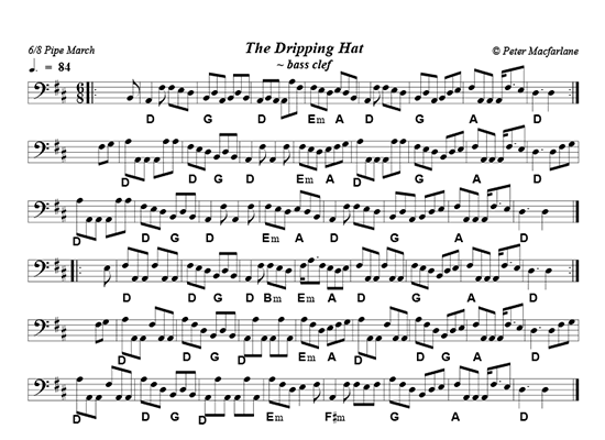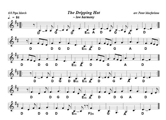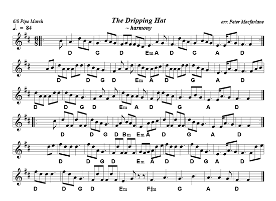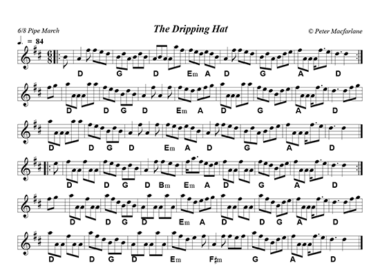 X:1 T:The Dripping Hat C:Peter Macfarlane R:6/8 Pipe March K:Dmaj M:6/8 L:1/8 |:B|"D"A2f fed|"G"BdA BdB|"D"ABA Aaf|"Em"fed "A"edB|"D"A2f fed|"G"BdA Bde|"A"fAA A/f3/e|"D"d3d2:|| f/g/|"D"aAA Aaa|"D"fed "G"BdB|"D"A2f A2f|"Em"fed "A"efg|"D"aAA Aaa|"G"fed Bde|"A"aAA A/g3/e|"D"d3 dfg| "D"aAA Aaa|"D"fed "G"BdB|"D"A2f A2f|"Em"fed "A"edB|"D"A2f fed|"G"BdA Bde|"A"fAA A/f3/e|"D"d3d2|| |:e|"D"fAA fAA|"D"fed "G"BdB|"D"A2f "Bm"fed|"Em"f/a3/f "A"ede|"D"fAA fAA|"G"fed Bde|"A"fAA A/f3/e|"D"d3d2:|| |:f/g/|"D"aAA fAA|"D"afd "G"BdB|"D"AaA AaA|"Em"afd "A"efg|"D"aAA fAA|"D"afd "G"Bde|"A"fAA A/f3/e|"D"d3 dfg| "D"aAA fAA|"D"afd "G"BdB|"D"AaA AaA|"Em"afde2f|"F#m"A2f fef|"G"afd Bde|"A"fAA A/f3/e|"D"d3d2:|]